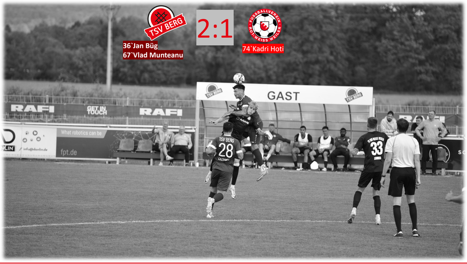 Doch die Partie wirkte zerfahren und hatte für die Zuschauer eher den Anschein, als würden zwei Bezirksligisten gegeneinander spielen. Weder die Gäste aus Weiler noch der TSV Berg kamen gut in die Partie. Viele Fehlpässe, Ungenauigkeiten und ein falsches Stellungsspiel bestimmten die 1. Halbzeit. Wenn der TSV Berg dann doch mal in den gegnerischen Strafraum kam, war noch ein Fuß des Gegners dazwischen oder aber der Abschluss war zu ungenau. In der 36. Minute blitzte dann doch kurz die Klasse des Gastgebers auf: der TSV Berg kombinierte sich schnell nach vorne und ein super Pass von Jonathan Merk auf Jan Büg brachte noch vor der Pause das 1:0.