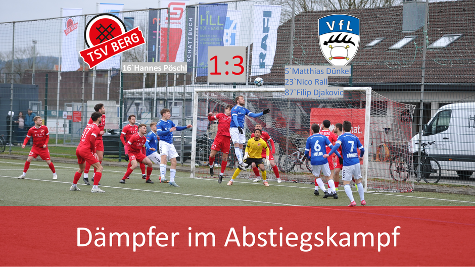 Doch gleich zu Beginn wurde die Mannschaft eines besseren belehrt. Nach einem Eckball stand es bereits nach fünf Minuten 0:1. Aber der TSV Berg machte weiter und man versuchte gleich den Ausgleich zu erzielen. In der 16. Minute gelang dies durch den Kopfball von Hannes Pöschl. Danach war es weiterhin ein Spiel mit einem Chancenplus für den TSV Berg. Aber es fehlte die letzte Konsequenz. Stattdessen erzielten die Gäste, nach einem erneuten Eckball, das 1:2.