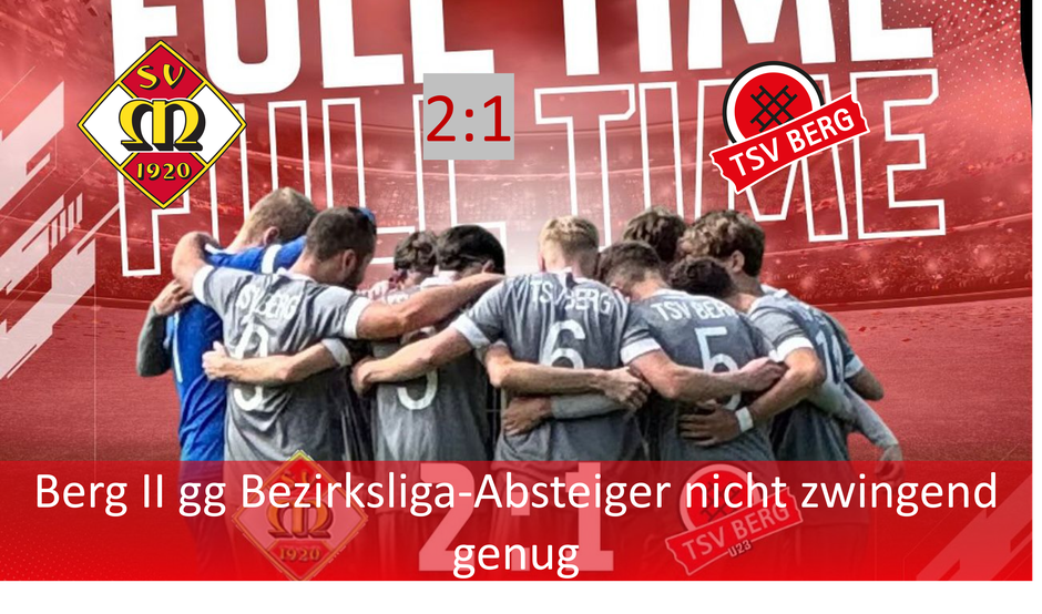 Der TSV Berg II zeigte zwar Kampfgeist, ließ jedoch über weite Strecken die letzte Durchschlagskraft vermissen. Die Niederlage ist bitter, weil man mit mehr Konsequenz im Abschluss und weniger Fehlern in der Defensive durchaus etwas hätte mitnehmen können. Nun gilt es, sich in allen Bereichen zu steigern, um in den kommenden Wochen wieder Punkte einzufahren.