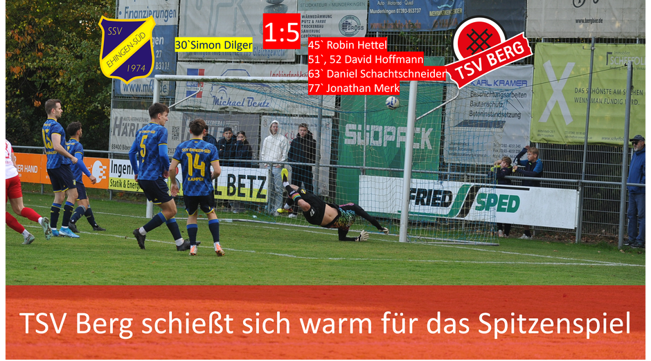 An diesem Samstag ging es für den TSV Berg zum Derby nach Ehingen Süd. Nach dem spielfreien Wochenende, wollte man an diesem Spieltag an die gute Leistung der vergangenen Wochen anknüpfen. Dies gelang in den ersten 20 Minuten auch sehr gut. Der TSV Berg bestimmte das Spiel und gab komplett die Linie vor. Doch im gegnerischen 16er war man dann zu inkonsequent. Nach 20 Minuten hatten die Gastgeber dann eine gute spielerische Phase und erzielten, nach einem Eckball, das 1:0. Die Mannschaft schüttelte sich kurz und war dann wieder klar fokussiert und konzentriert. Jeder arbeitete für den anderen und die Laufbereitschaft war enorm. Kurz vor der Halbzeitpause schoss Robin Hettel, mit einem tollen Sololauf, das 1:1.